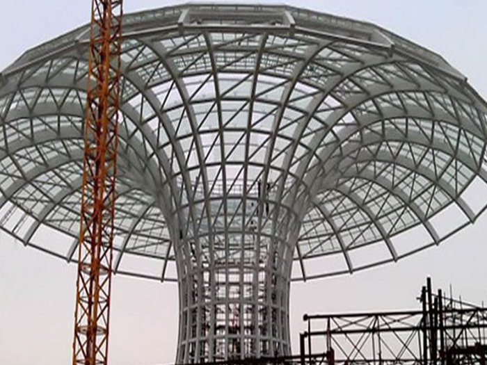 二、球形网架结构因其结构新颖,受力合理,自重轻、用钢量低等优点。如大型体育场馆球形宜兴螺栓球网架、公共场馆球形网架、电厂宜兴螺栓球网架、水泥工业球形网架、仓储物流球形网架、宜兴干煤棚工业球形网架、宜兴收费站宜兴加油站球形网架、展览中心、影剧院、商场、航站楼、候车厅、工厂宜兴车间、仓库、电视塔等球形螺栓球节点网架。国内球形网架结构主要分为:宜兴焊接球节点网架及螺栓球节点网架两种。螺栓球节点网架其构件工厂内加工量较大,现场安装便捷,适用于现场工期紧,宜兴施工条件、用电量受制约,网架形状复杂、宜兴杆件定位困难的异形结构。螺栓球节点球形网架系统基本由宜兴杆件、螺栓球、支撑支座等组成。按照节点形式可分为交叉宜兴桁架体系、四角锥体系、三角锥体系等。支撑方式多为固定支座支撑。对于大面积、大跨度及有特殊受力或伸缩要求的网架结构可采用橡胶支座、滑移支座、球铰支座等支撑形式,以满足结构自身的受力稳定、均衡,便于内力释放等设计要求。